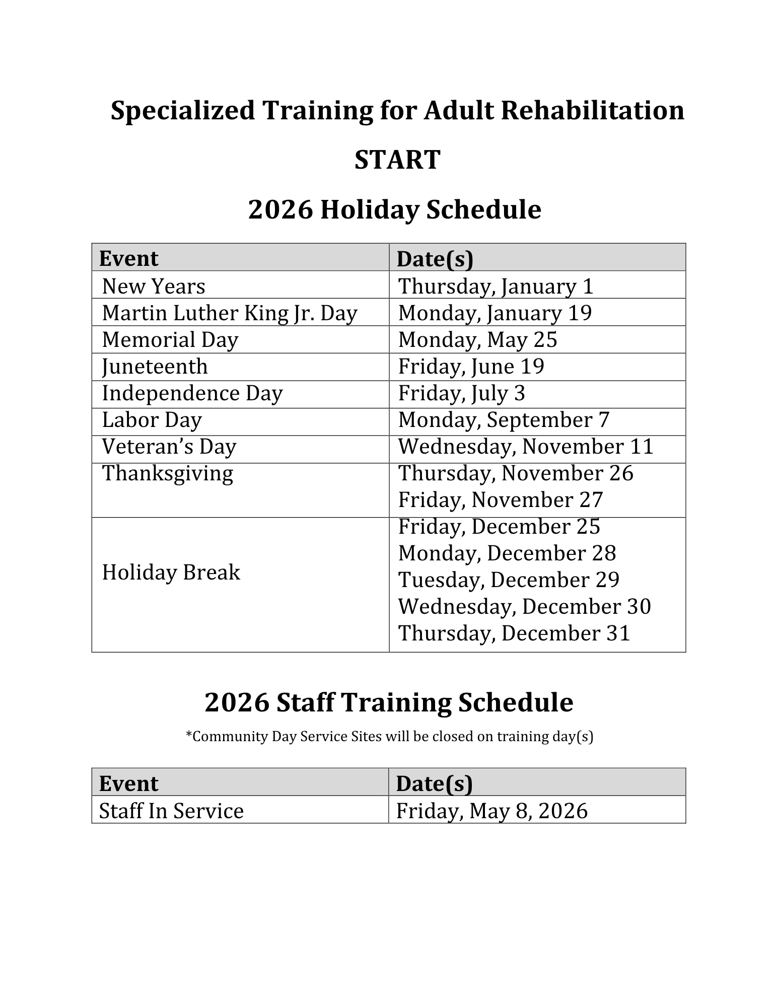 Community Day Services will be closed to individuals. START plans to reopen CDS on Monday, February 2, 2026 and will provide transportation to individuals where it is safe to do so. Please assure the individual has a safe path from their home to the vehicle loading area.